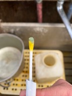 こちらの綿棒で汚れをチェックすることができます。汚れの部分は黄色(写真1枚目)から緑色(写真2枚目)に変化します。